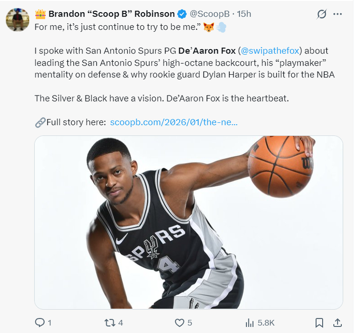在这场比赛之前,福克斯刚刚接受了Scoop B的专访,福克斯表示在马刺这支充满后场球员的球队打球最主要的是做自己,在防守端也要有组织者的心态,会帮助哈珀更快的适应NBA的节奏。【结果福克斯就是用18中4来做自己】